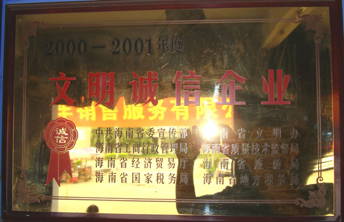 海南省瓊海勝達汽車(chē)銷(xiāo)售服務(wù)有限公司在2000年度至2001年度榮獲由: